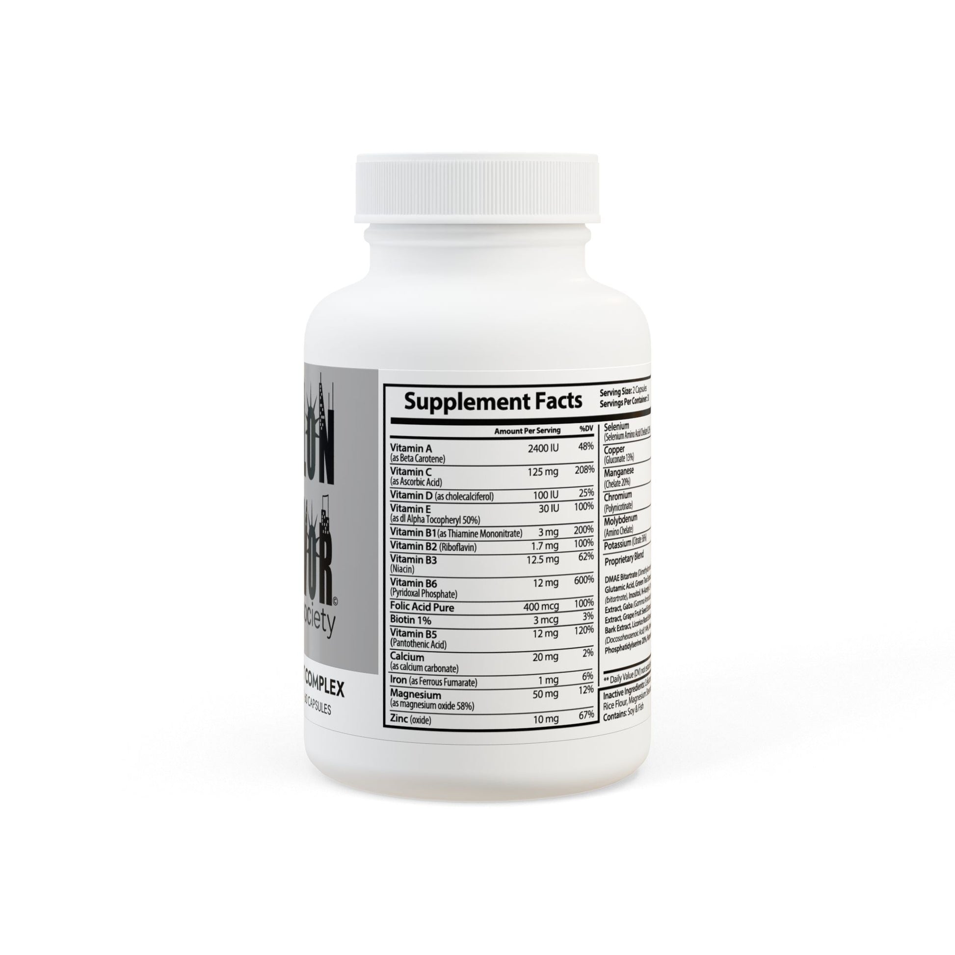 Ingredients: Vitamin A (as Beta Carotene), Vitamin C (as Ascorbic Acid), Vitamin D (as cholecalciferol), Vitamin E (as dl Alpha Tocopheryl 50%), Vitamin B1(as Thiamine Mononitrate), Vitamin B2 (Riboavin), Vitamin B3 (Niacin), Vitamin B6 (Pyridoxal Phosphate), Folic Acid Pure, Biotin, Vitamin B5 (Pantothenic Acid), Calcium (as calcium carbonate), Iron (as Ferrous Fumarate), Magnesium (as magnesium oxide 58%), Zinc (oxide), Selenium (Selenium Amino Acid Chelate 0.2%), Copper (Gluconate 13%), Manganese (Chelate 20%), Chromium (Polynicotinate), Molybdenum (Amino Chelate), Potassium (Citrate 36%), DMAE Bitartrate (Dimethylaminoethanol), L Glutamine, Glutamic Acid, Green Tea Extract, Bacopa Extract, Choline (bitartrate), Inositol, N-Acetyl L-Tyrosine, Bilberry Fruit Extract, Gaba (Gamma Aminobutyric Acid), Grape Seed Extract, Grape Fruit Seed Extract, Olive Leaf, Cinnamon Bark Extract, Licorice Root Extract, Boron (Citrate), DHA (Docosahexaenoic Acid) 14%, Vanadyl Sulfate 19%, Phosphatidylserine 20%, Huperzine A. Inactive Ingredients: Cellulose (Vegetable Capsule), Rice Flour, Magnesium Stearate, Silicon Dioxide. Contains: Soy & Fish