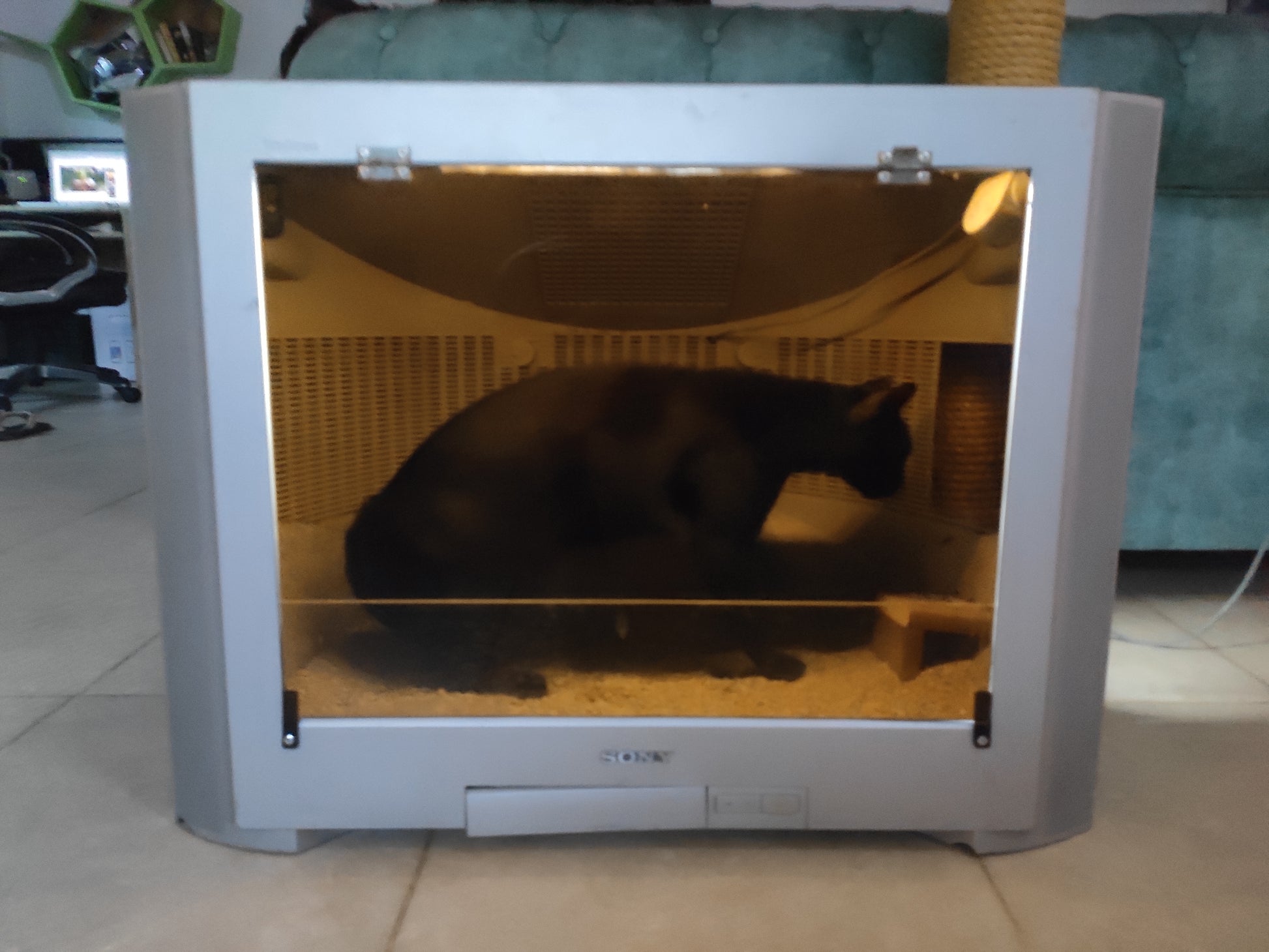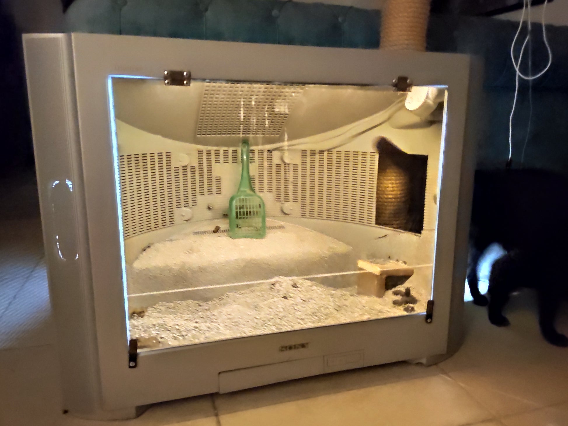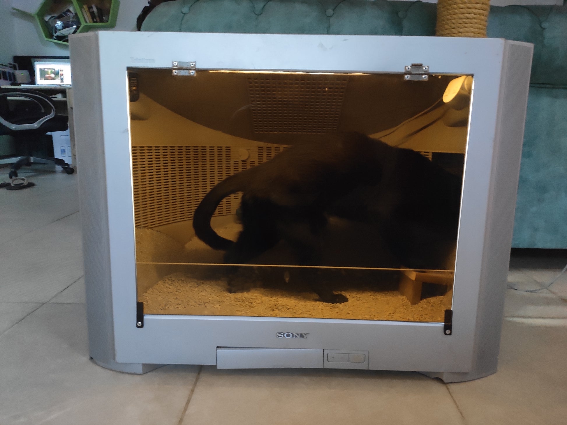 The original screen was replaced by a dark Plexiglas panel that continues to fool us that it is still a standard TV, but thanks to the motion sensor inside, which turns on the LED lighting when the cats enter from the side, you realize that this is no longer a regular TV, but a genius artwork that will put shame on all those criminals who were trying to manipulate and enslave the minds of the human race through television, and bring them to justice before they accomplish their wicked agenda.
