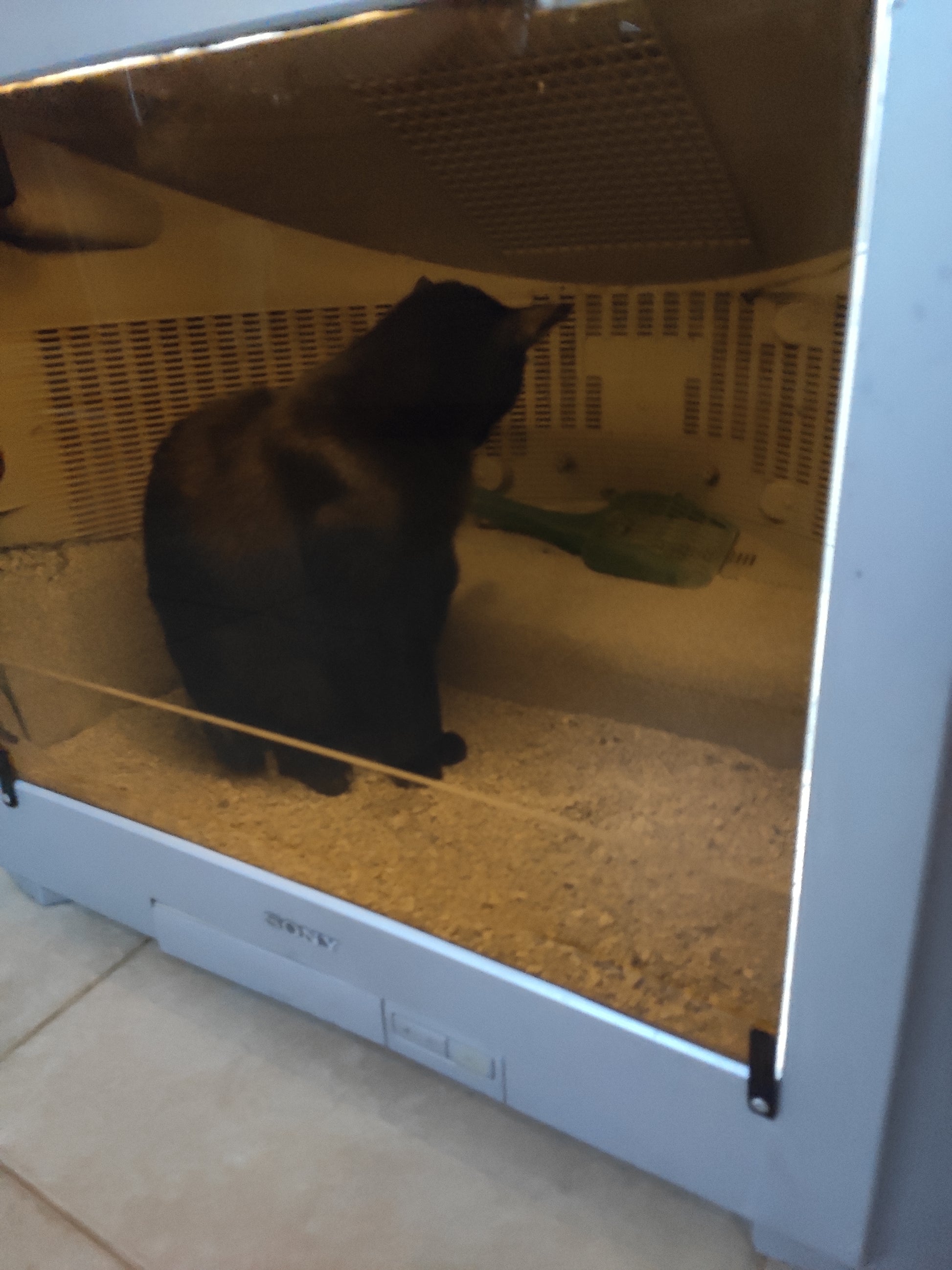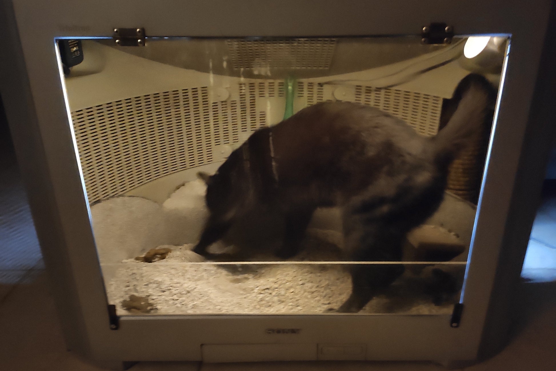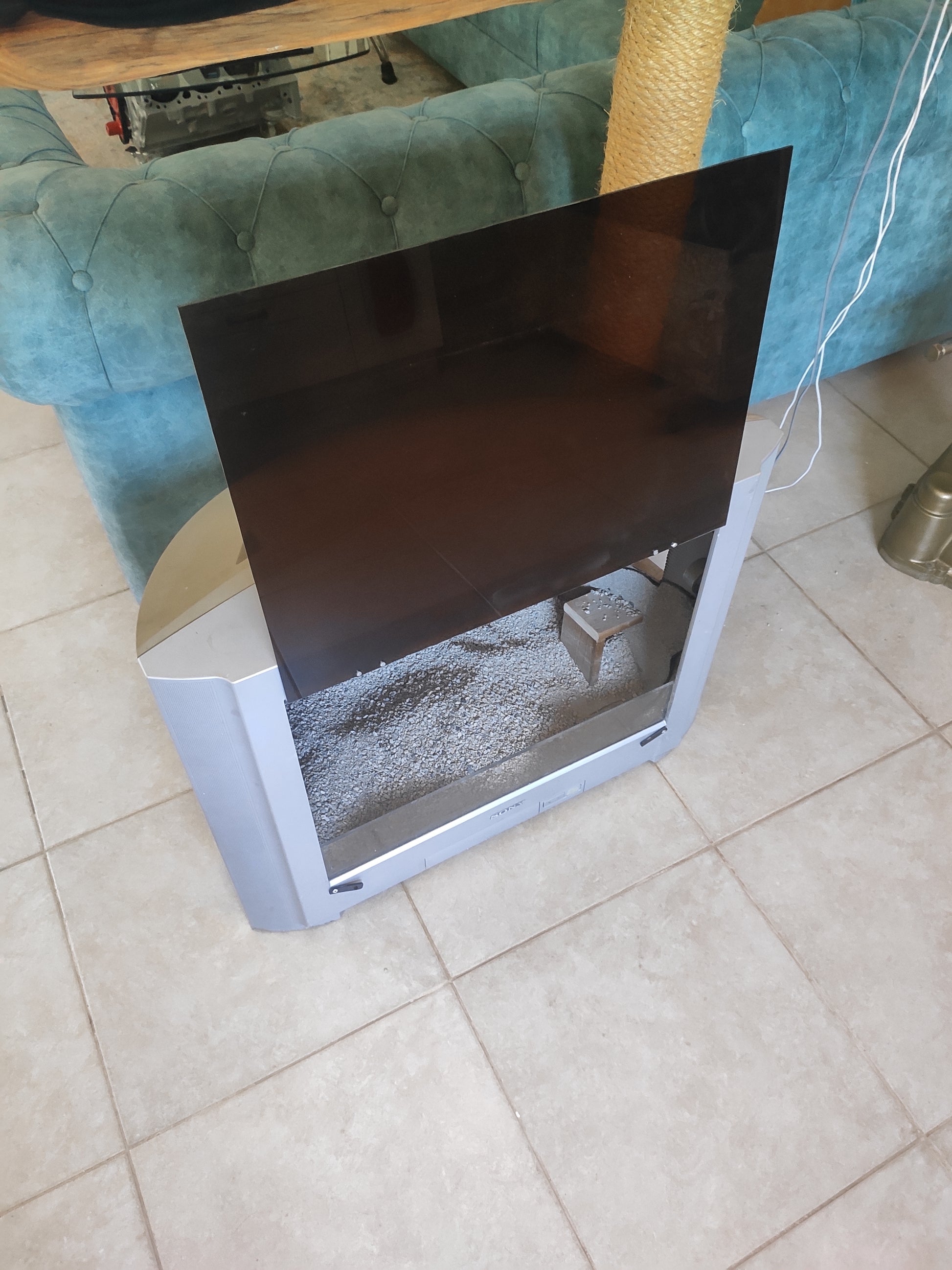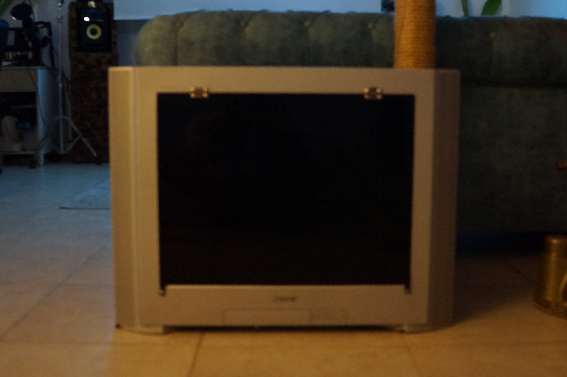 The original screen was replaced by a dark Plexiglas panel that continues to fool us that it is still a standard TV, but thanks to the motion sensor inside, which turns on the LED lighting when the cats enter from the side, you realize that this is no longer a regular TV, but a genius artwork that will put shame on all those criminals who were trying to manipulate and enslave the minds of the human race through television, and bring them to justice before they accomplish their wicked agenda.