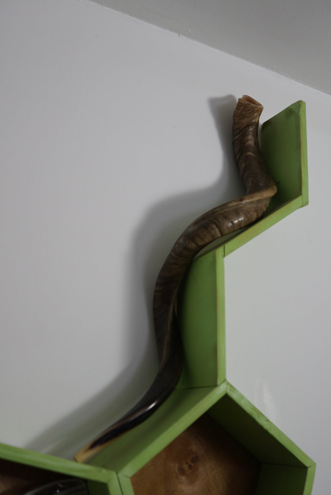 A huge Codo Shofar along with a pinewood shelf in the shape of the molecule of the hormone 'Serotonin' which is responsible for the feeling of love, joy and happiness which we so desperately want more of it and sometimes forget or have difficulty practicing it.